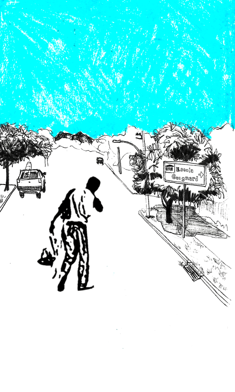 Em Geraldo sobe a Afonso Pena, criei uma intervenção com lambes no mural coletivo da exposição, imaginando um percurso de Geraldo pela avenida que conecta a escultura de Mary, o parque e as montanhas dos Mangabeiras, onde hoje está a escola. Usei as saliências da arquitetura do Palácio como molduras improvisadas para construir essa narrativa gráfica a partir dos desenhos de observação e um stêncil baseado no registro de Teixeira.